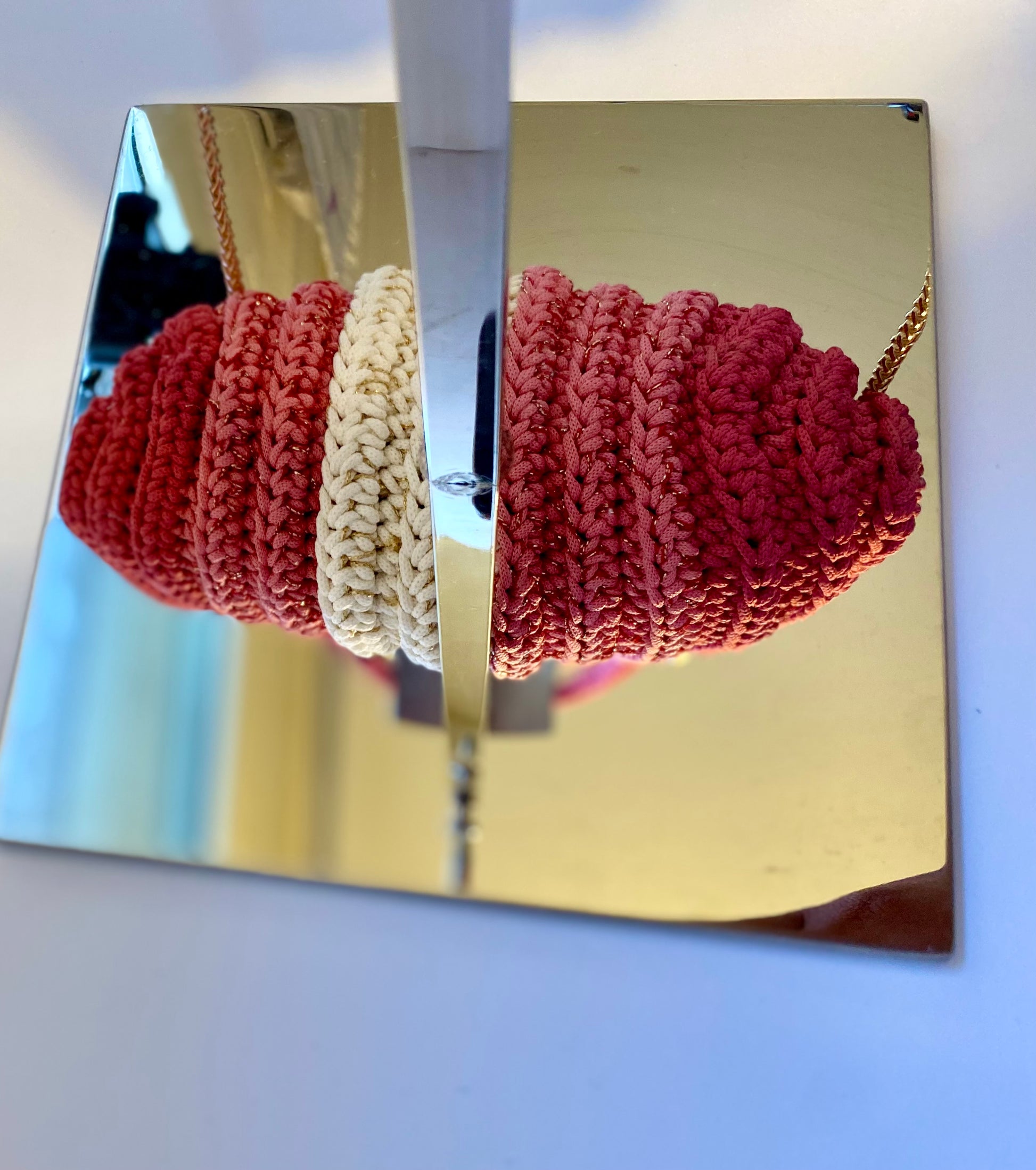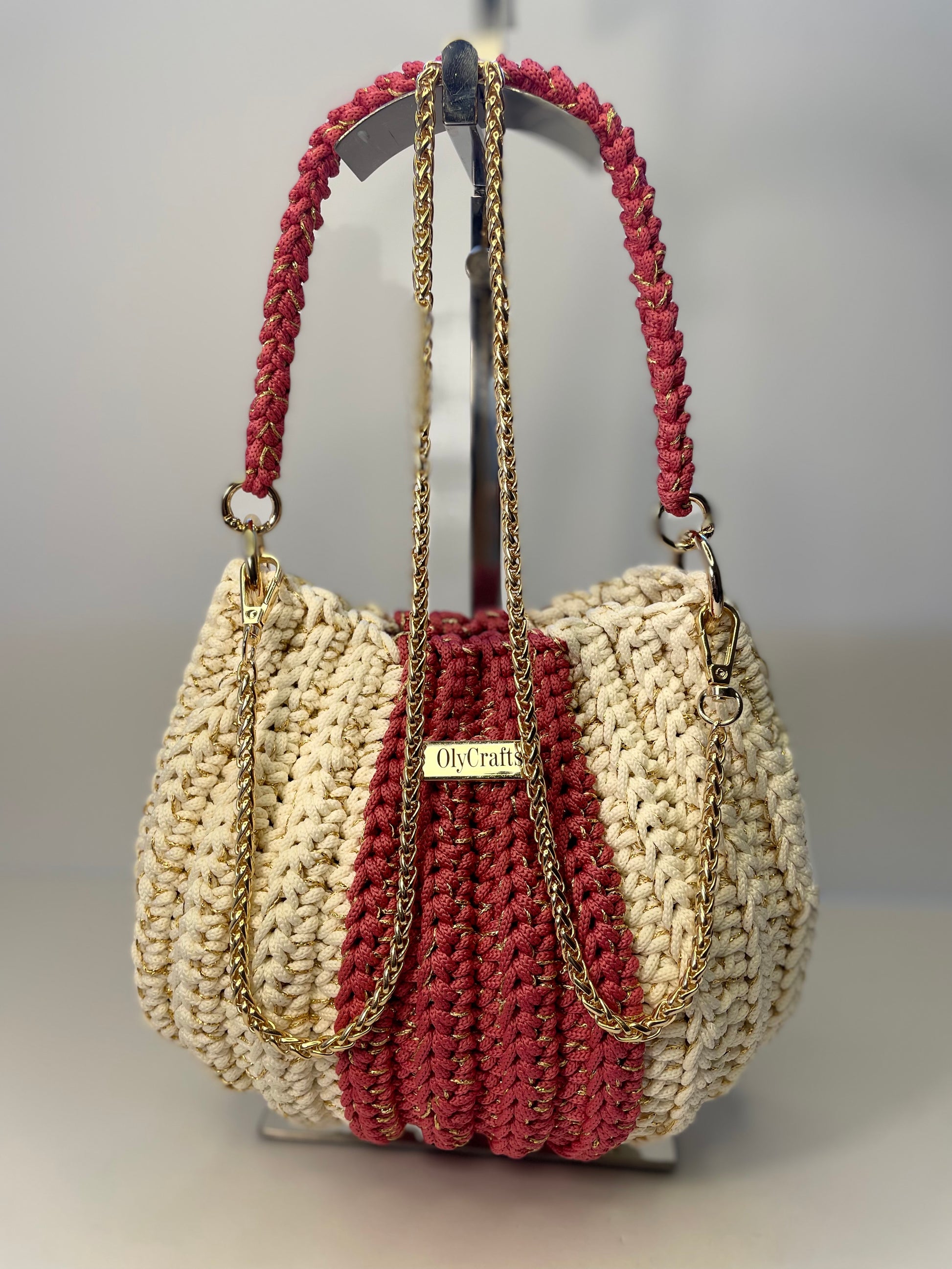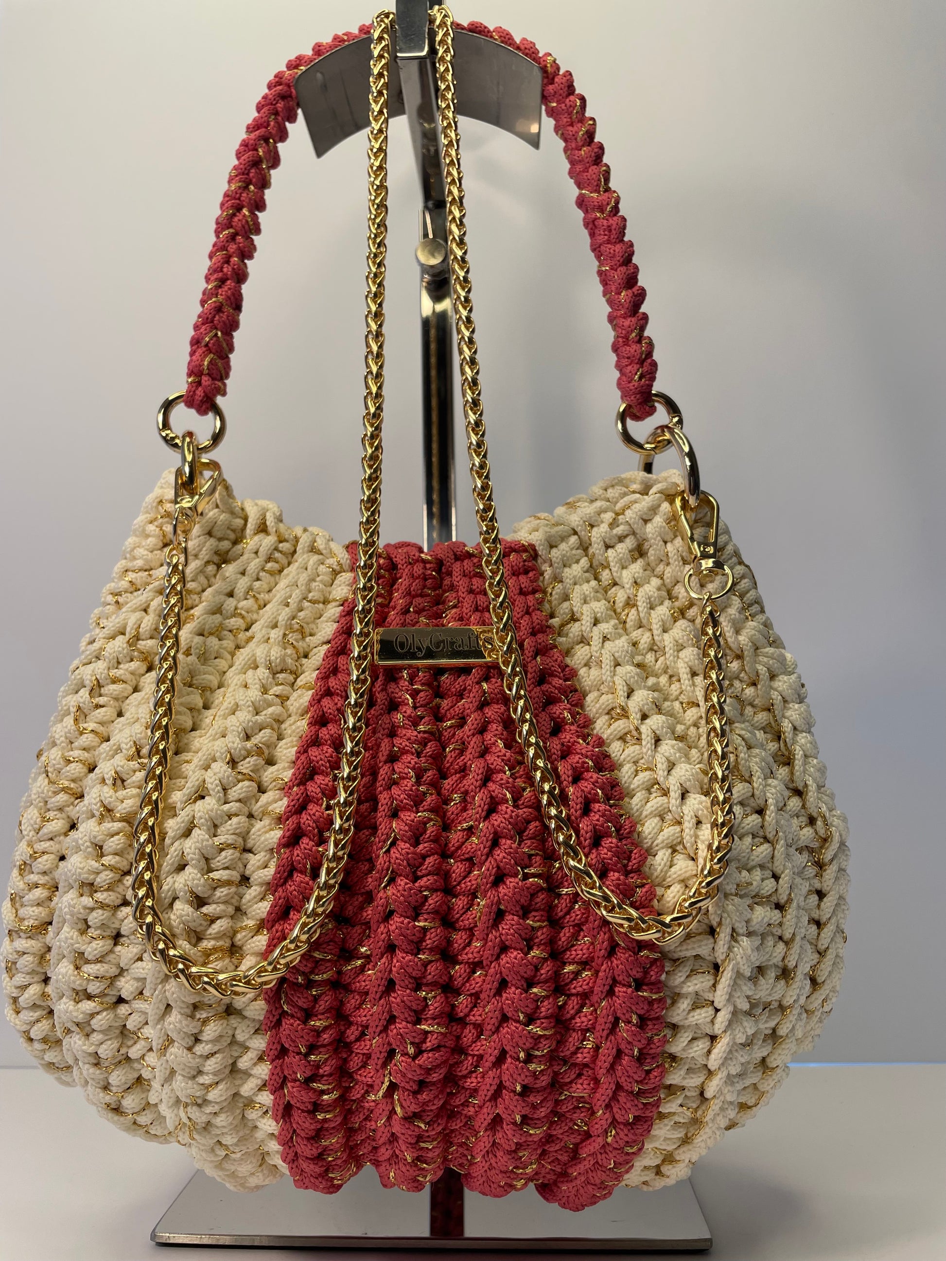 A beautifully handmade crochet shoulder bag crafted in the spirit of slow fashion. Featuring a two-tone cream and rose design, gold accents, and a comfortable braided strap, this artisanal piece adds effortless elegance to any outfit.