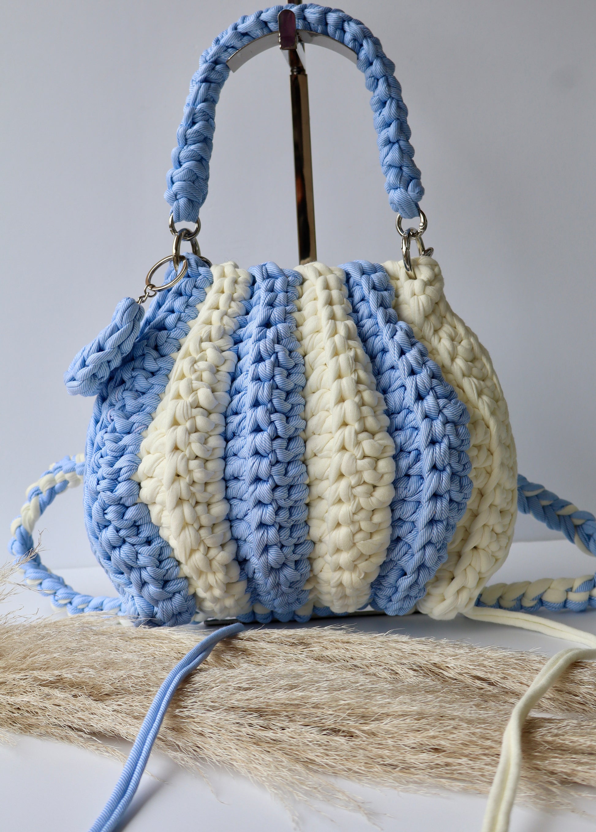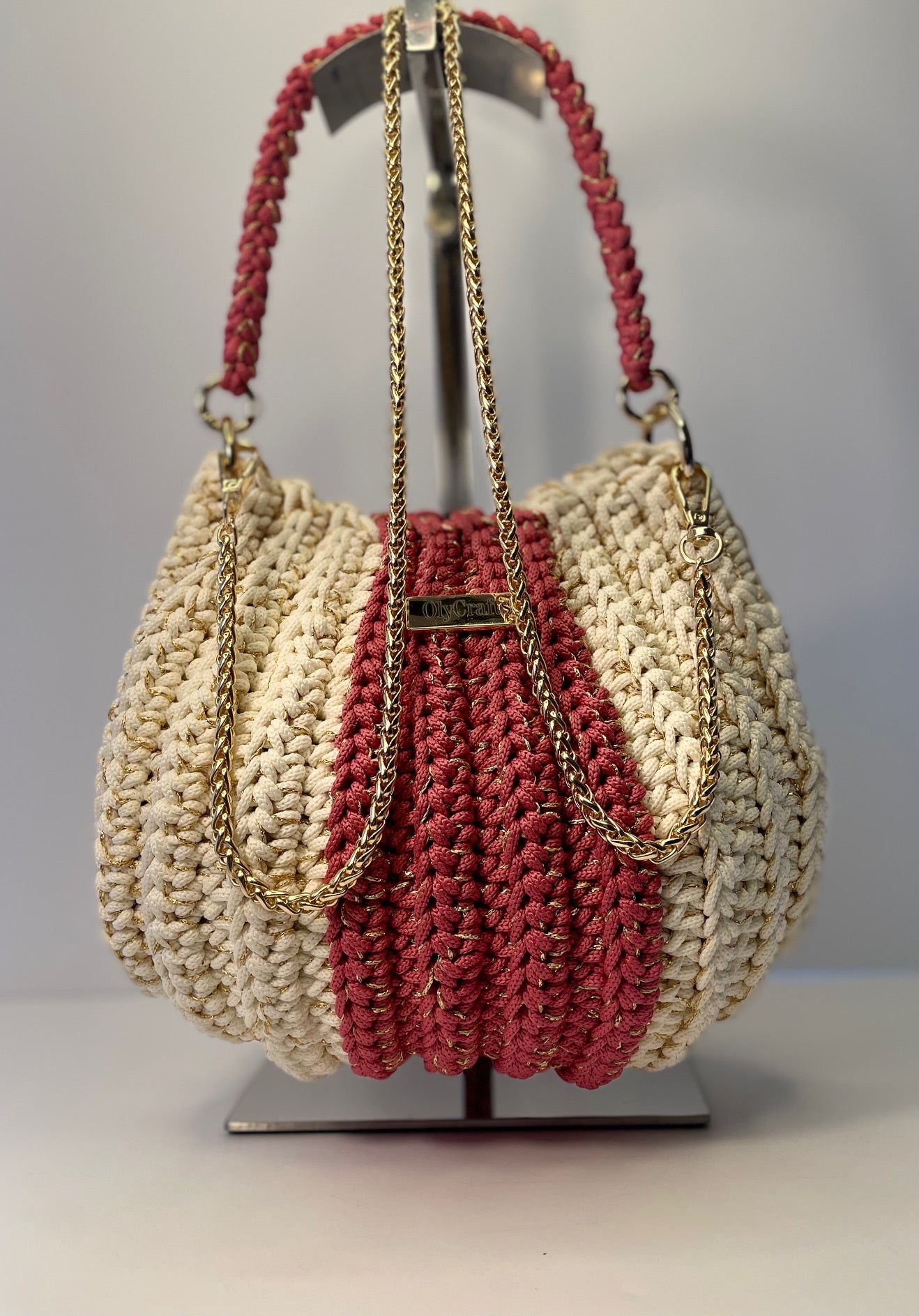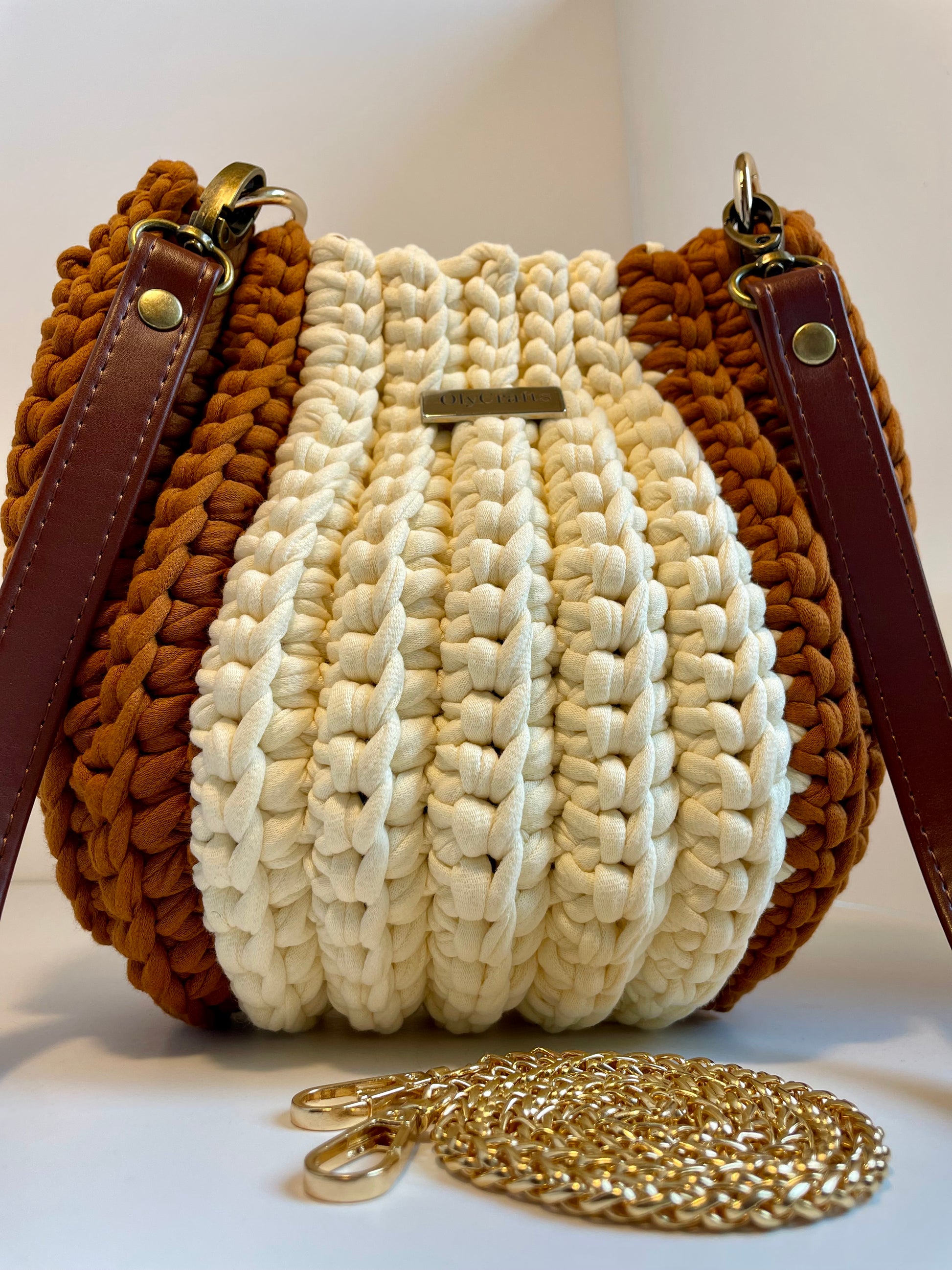 Crocheted with a firm and structured finish striking combination of colors, small crochet strap to be used as handle and a slim 80cm gold chain that can beused as a shoulder or crossbody strap or decorative item.