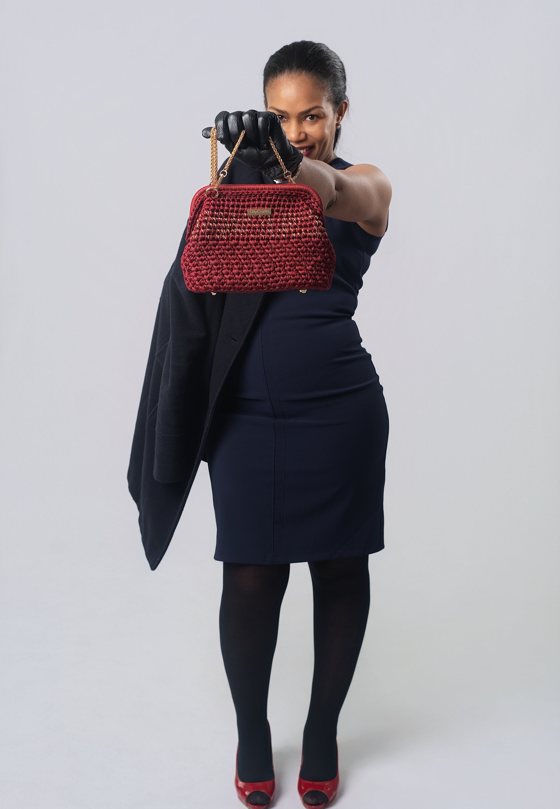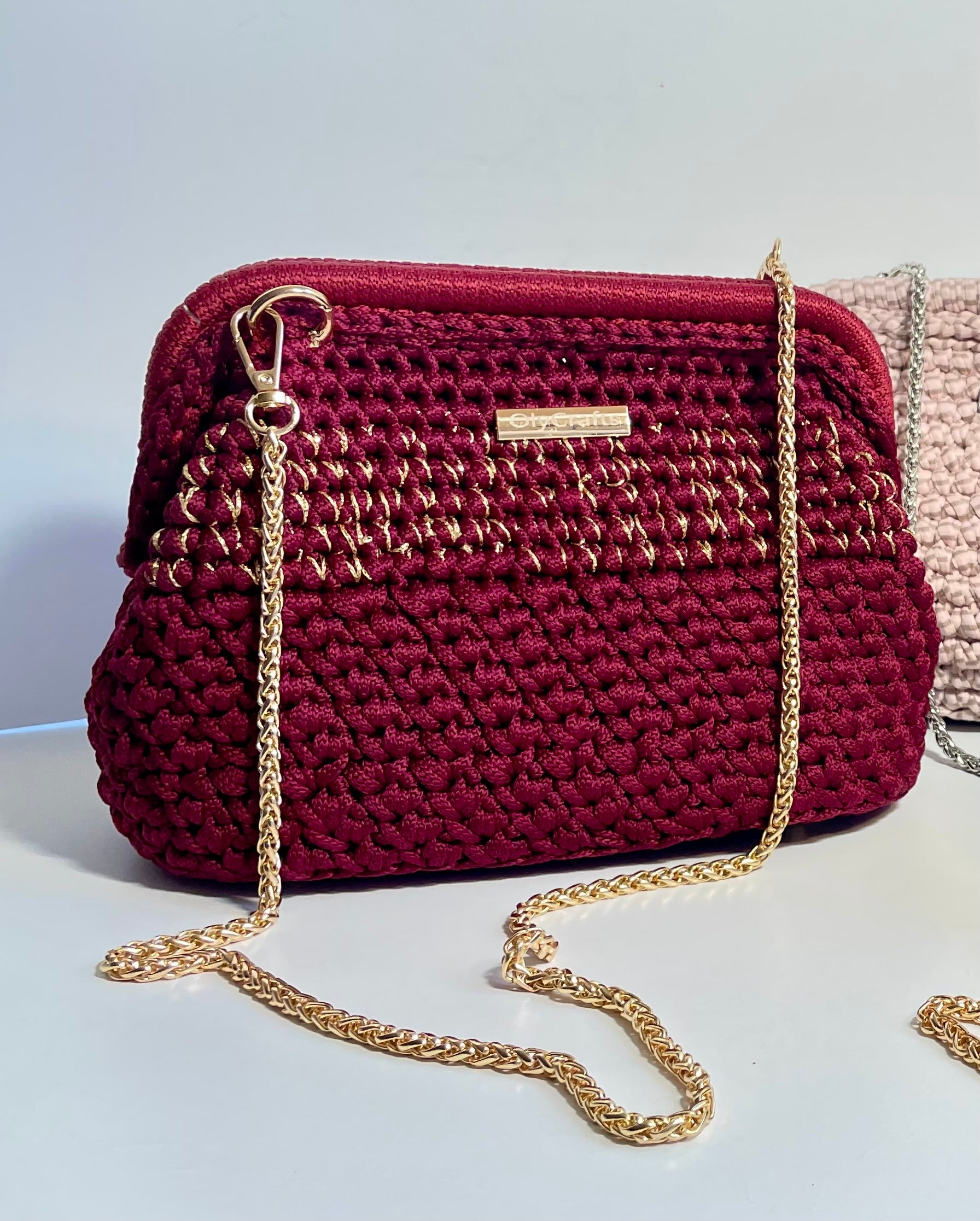 In Bordo and golden lurex yarn, blending an elegant, modern, and luxurious piece