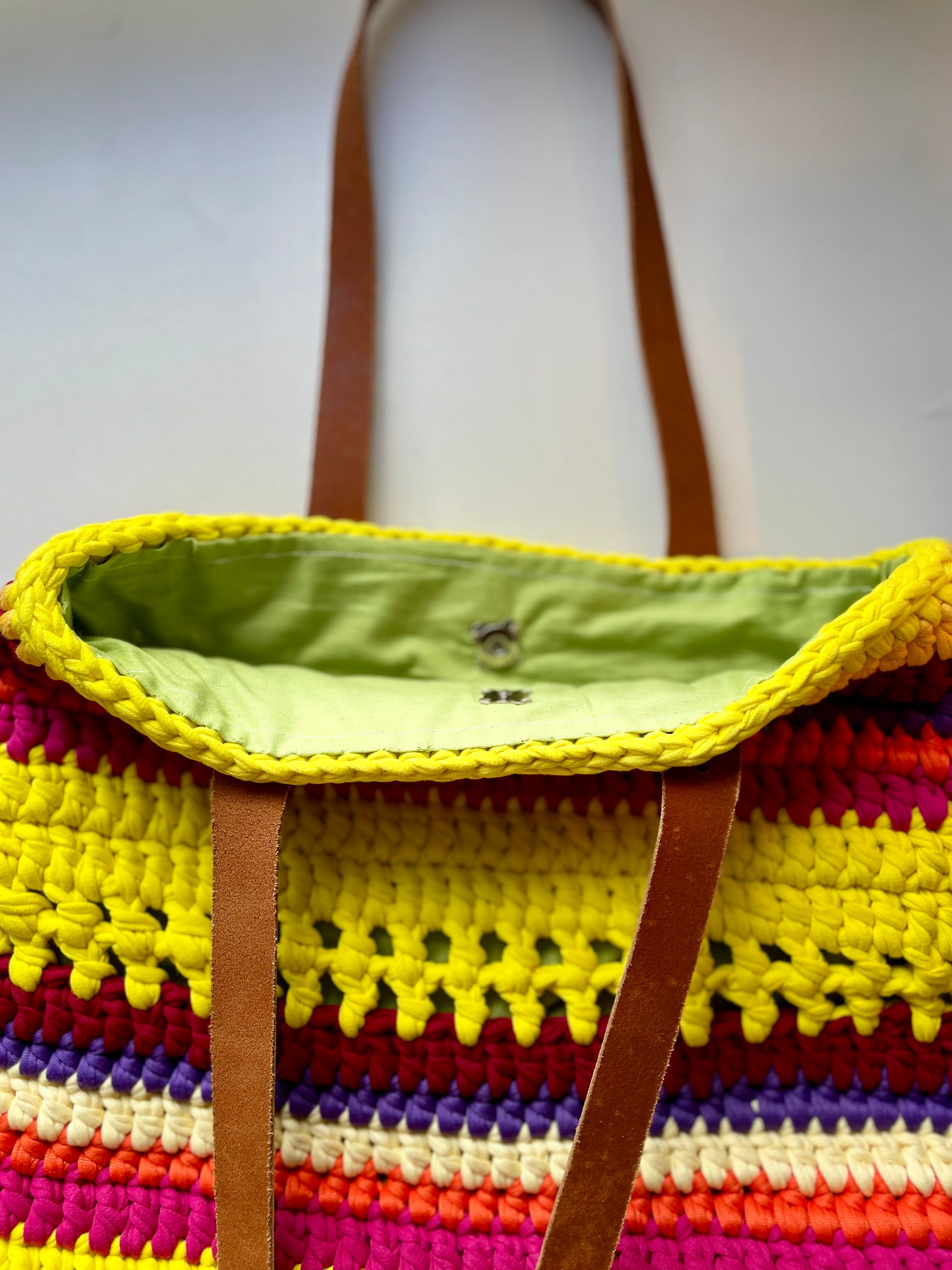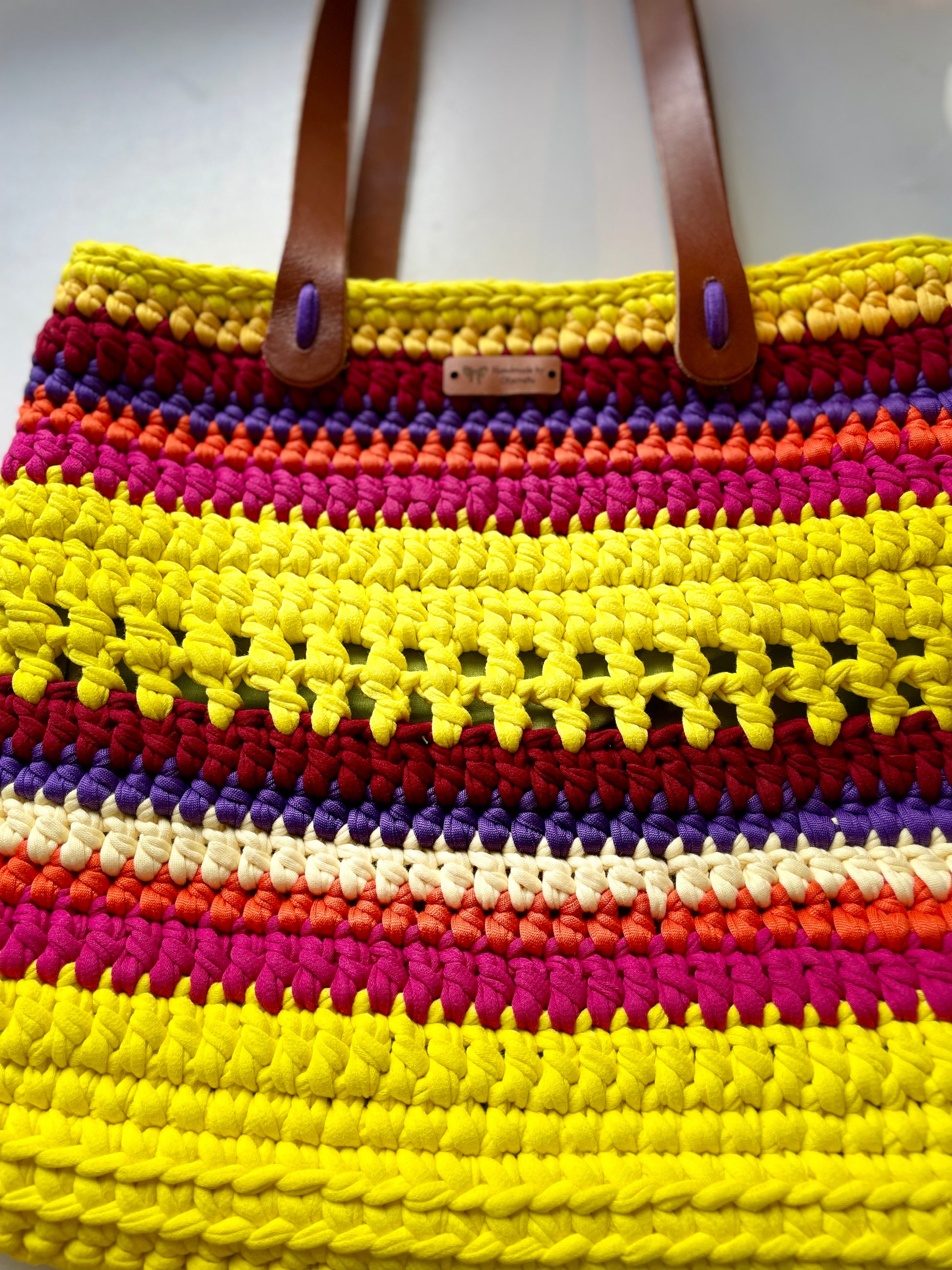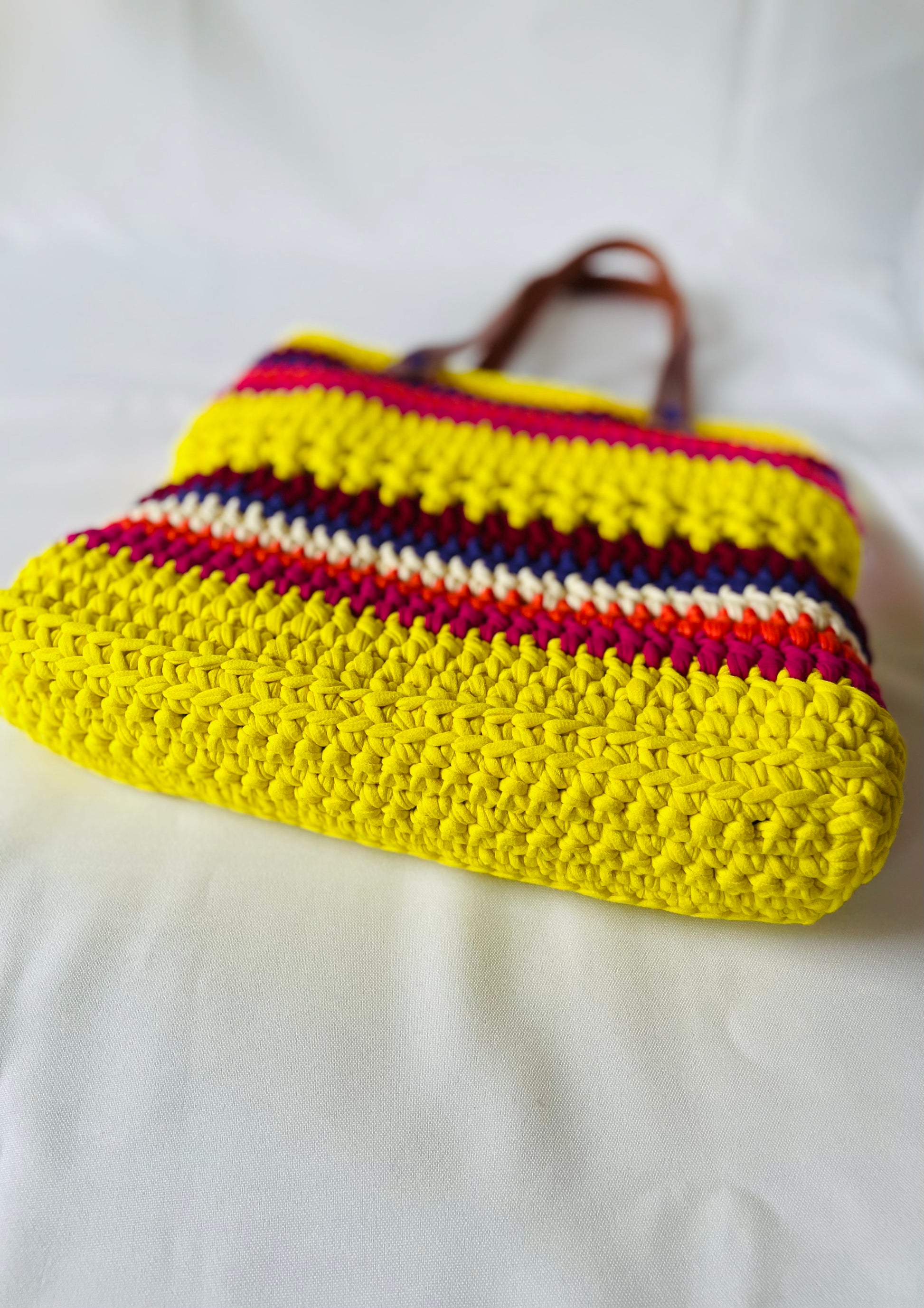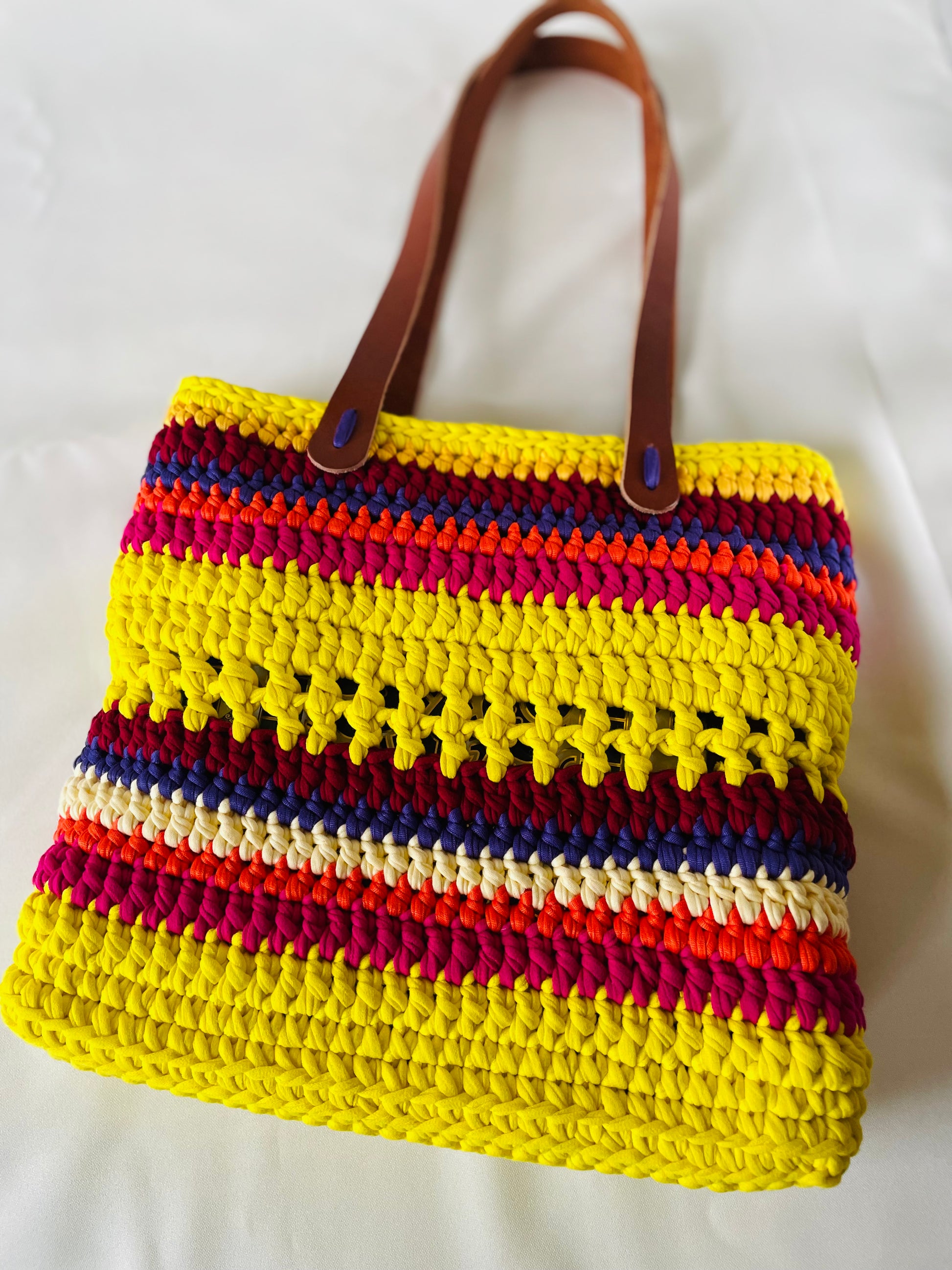 Stella is a Shoping bag style, with genuine leather straps crafted from thick cotton yarn, firm texture and a structured shape. Features multiple colours, perfect for adding a pop of texture and boldness to your Sundays.