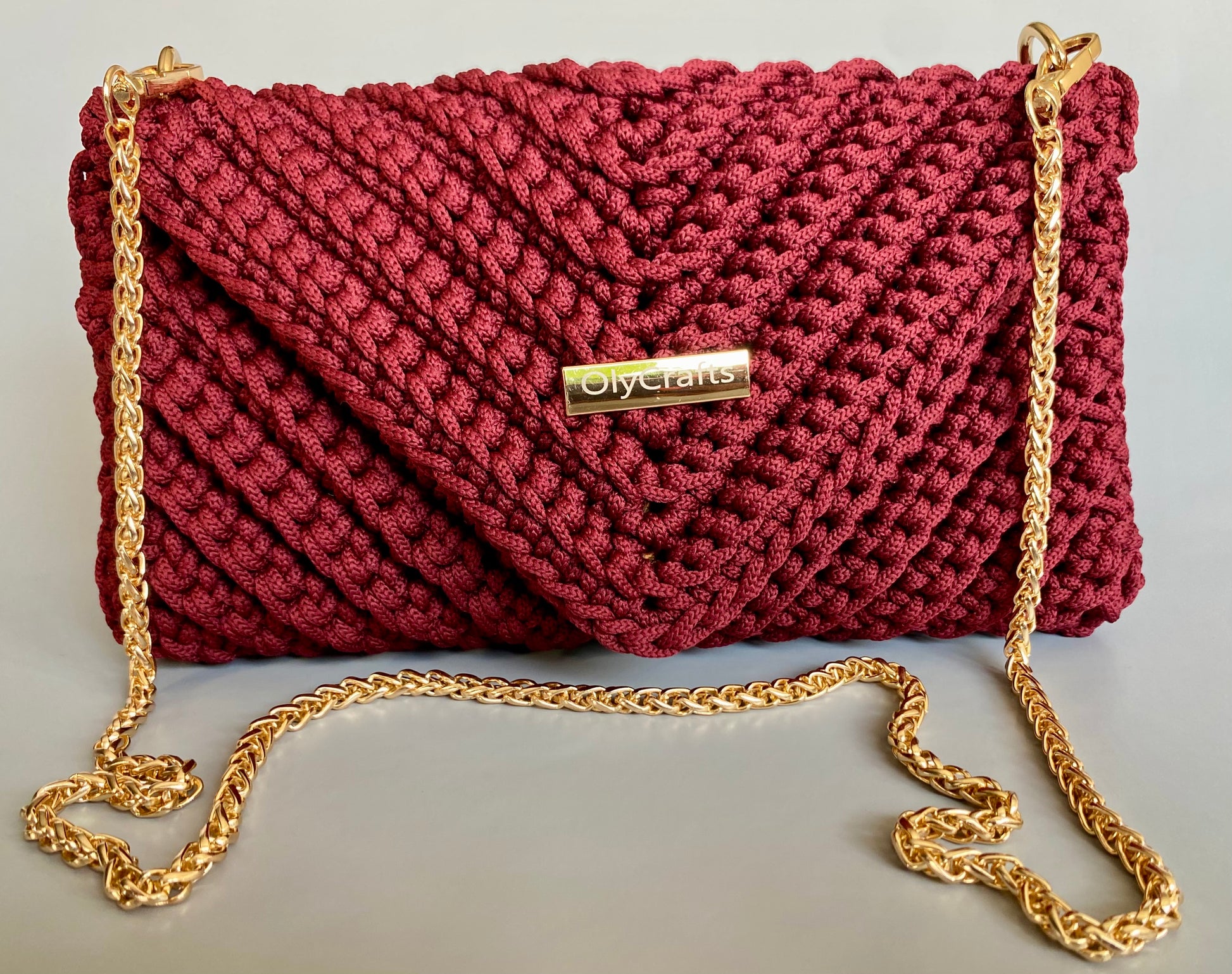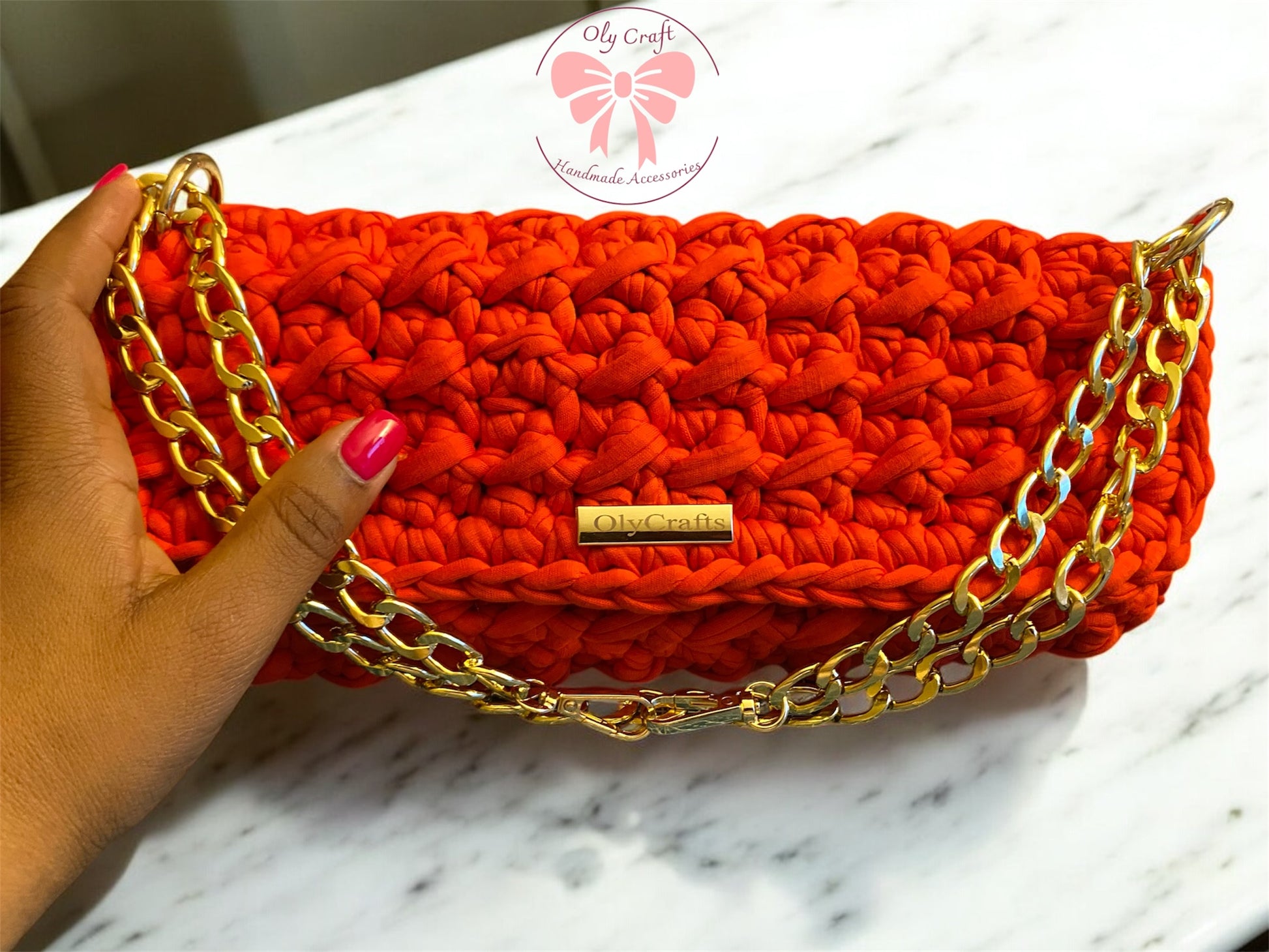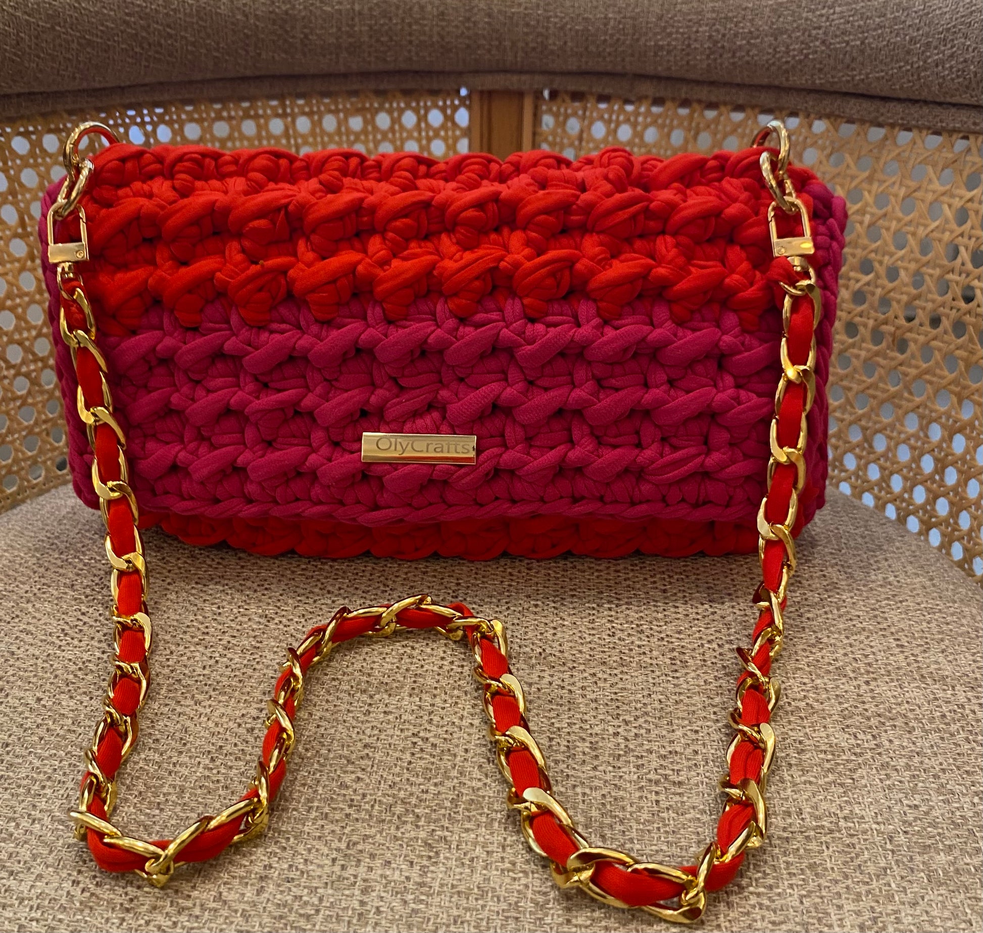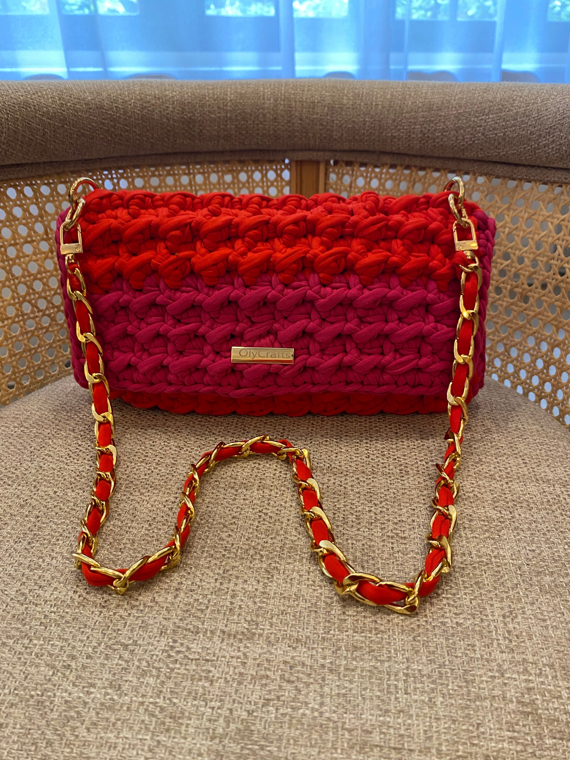 Zola is a Clutch in Baguette style combining two harmonious shades, vibrant red and Fushia. Made from thick t-shirt yarn, crocheted with a firm and structured finish. which intertwine beautifully, creating a bold and modern visual effect.